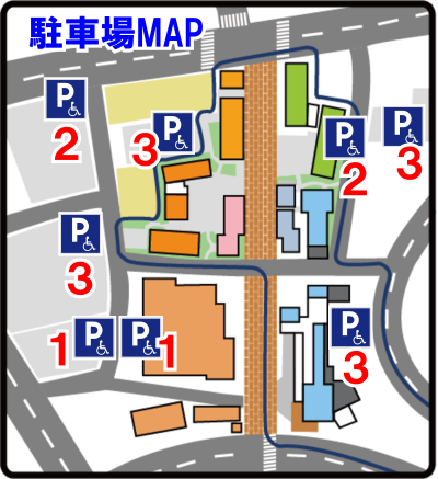 周辺には無料の町営駐車場が点在しています。上の図の赤い数字は車いす優先駐車場の台数です。
