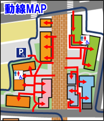 ※下の図の赤い線が車いすでの動線になりますので参考にしていただければと思います。